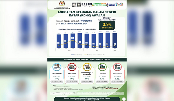 KUALA LUMPUR, 19 April – Ekonomi Malaysia diunjur tumbuh 3.9 peratus pada suku pertama 2024, berdasarkan anggaran awal diterbitkan Jabatan Perangkaan Malaysia (DOSM).