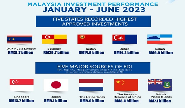 Sementara itu, lima negeri teratas yang merekodkan nilai pelaburan yang ketara kepada jumlah pelaburan yang diluluskan ialah Kuala Lumpur RM31.7 bilion, Selangor RM29.7 bilion, Kedah RM14.6 bilion, Johor RM14.2 bilion dan Sabah RM9 bilion.