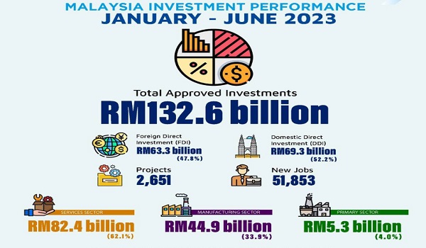 KUALA LUMPUR, 17 September- Malaysia telah menarik sejumlah RM132.6 bilion pelaburan yang diluluskan dalam sektor perkhidmatan, pembuatan dan utama, melibatkan 2,651 projek dari Januari hingga Jun tahun ini.