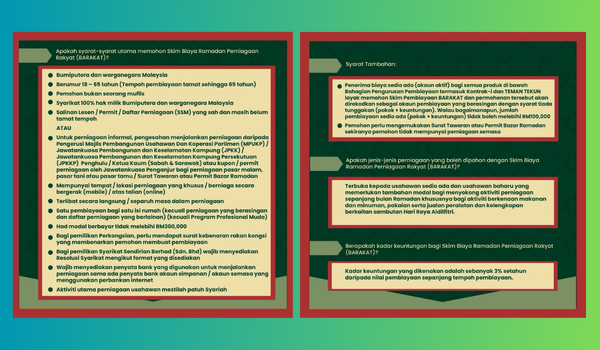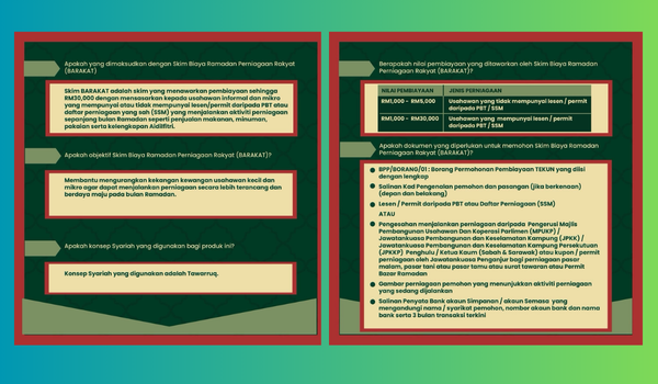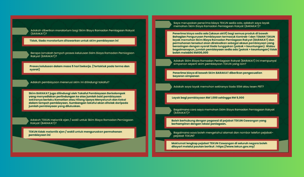 Menerusit program BARAKAT, TEKUN menyediakan pembiayaan sehingga RM30,000 dengan kadar keuntungan 3% setahun serta tempoh pembiayaan sehingga 12 bulan. Ini bakal memberi manfaat kepada para peniaga dan penjaja kecil dalam sektor makanan dan minuman, pakaian serta barangan keperluan bagi menyokong aktiviti perniagaan sepanjang Ramadan dan menjelang Aidilfitri.