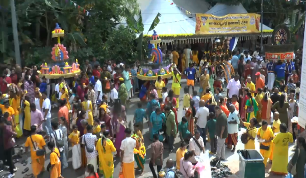 - Perarakan menampilkan kavadi dan belanga susu sebagai simbol nazar dan pengabdian kepada Dewa Thirumurugan.