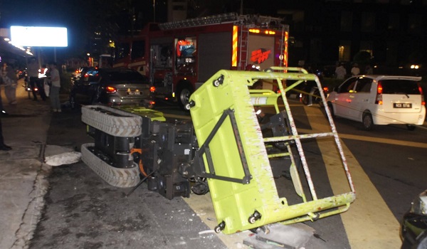 - Kren jenis spider lift yang dikendalikan menggunakan alat kawalan jauh terlanggar tebing kaki lima sebelum hilang imbangan dan terbalik.