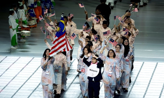 Malaysia hadir sebagai negara ke-47, menampilkan 25 atlet bergaya dalam pakaian kebangsaan berona pic dengan sentuhan biru.