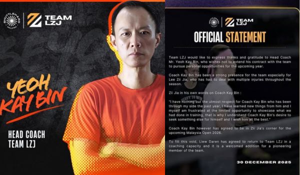 Meskipun tidak menyambung kontraknya, Kay Bin bersetuju untuk terus berada di sisi Zii Jia bagi menghadapi Kejohanan Badminton Terbuka Malaysia 2026 yang akan berlangsung dari 6 hingga 11 Jan di Axiata Arena, Bukit Jalil di sini.