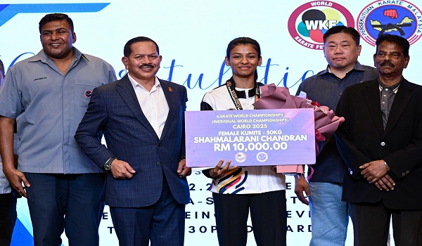 SEPANG, 2 Disember - Atlet karate wanita negara, C. Shahmalarani menerima durian runtuh sebanyak RM10,000 daripada Persekutuan Karate Malaysia (MAKAF) sebagai penghargaan atas kejayaannya meraih pingat perak pada Kejohanan Karate Dunia di Kaherah, Mesir, baru-baru ini.